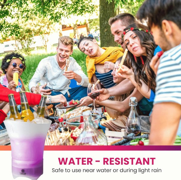 Balde de gelo portátil e dobrável que combina funcionalidade e entretenimento. Ele mantém suas bebidas geladas por horas e, ao mesmo tempo, conta com um alto-falante Bluetooth embutido para tocar música onde quer que você esteja. Além disso, possui luzes LED que criam um ambiente animado para festas e encontros.